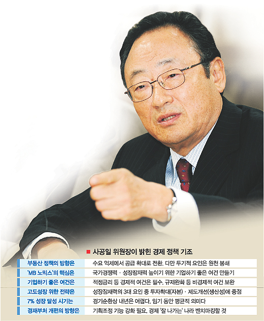 그는 이 당선자의 공약인 연 7% 성장과 관련,“기업이 활동하기 좋은 여건만 조성하면 7% 성장이 가능하지만, 경기 순환 측면에서 내년에는 고성장이 어려울 것”이라고 전망했다.
