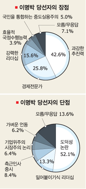 그러나 직종별 구분에서 농·어업 종사자와, 학력별 구분에서 중졸 이하의 응답자는 이 당선자의 ‘경제전문가’이미지를 최고의 장점으로 택했다. 무엇보다 ‘먹고사는’ 경제문제를 해결해 주기를 바라는 서민층의 바람이 반영된 결과로 풀이된다. 반면 이 당선자의 단점에 대한 질문에 대해 국민의 절반 이상이 ‘도덕성 논란’을 꼽았다.
