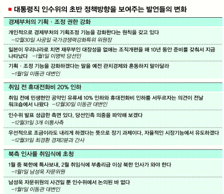 이 당선인은 하지만 곧이어 열린 인수위 시무식에서 “나라를 위해 인수위가 만드는 문서에 혼을 담아 달라.”며 기본적인 주문을 했다. 초반 조급증으로 ‘아마추어리즘’을 노출하기보다는 국가에 대한 철학이 바탕이 된 인수위 업무를 기대한다는 뜻으로 읽힌다.