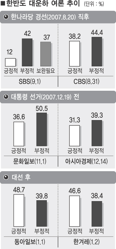 대운하에 대한 부정적인 여론은 대선 기간에도 계속됐다. 문화일보가 11월1일에 보도한 여론조사를 보면 대운하에 찬성한다는 의견은 36.6%에 불과한 반면 반대한다는 의견은 50.5%에 이르렀다.