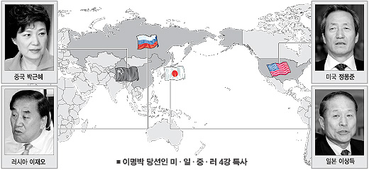 미국 정몽준, 중국 박근혜, 일본 이상득, 러시아 이재오 의원 등 이명박 대통령 당선인이 이달 중순 한반도 주변 4강에 보내기로 한 특사의 면면은 2002년 노무현 대통령 인수위 때를 연상케 한다. 중량감 있는 다선(多選)의 정치인이라는 점과 함께 계파를 초월했다는 공통점을 지닌다.