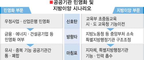 우선 정보통신부 산하 우정사업본부와 산업은행의 향배가 대대적인 공기업 민영화 또는 통·폐합의 ‘신호탄’이 될 것으로 보인다. 최경환 인수위 경제2분과 간사는 지난 5일 정통부 업무보고 때 “정통부는 ‘우정청’을 거쳐 2012년 민영화 방안을 제시했으나, 우정청을 거칠 필요가 있는지 의견이 분분해 보완하기로 했다.”고 설명했다. 따라서 우정사업본부는 우정청을 거치지 않고, 곧장 민영화될 가능성이 점쳐진다. 우정사업을 담당하는 집배원은 3만 3000여명으로, 인위적인 구조조정 없이도 국가공무원 수를 6% 가까이 줄이는 효과를 거둘 수 있다.