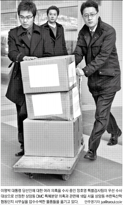이명박 대통령 당선인을 둘러싼 각종 의혹을 수사하고 있는 정호영 특별검사팀은 18일 상암 디지털미디어센터(DMC) 특혜분양 의혹 사건과 관련해 처음으로 압수수색을 실시하는 등 수사에 속도를 내고 있다.