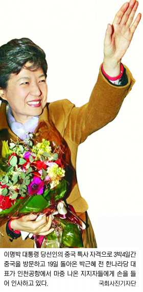 이 당선인의 특사 자격으로 3박4일간의 중국 방문을 마치고 지난 19일 귀국한 박 전 대표는 공심위원 구성을 지켜본 뒤 명확한 입장을 표명할 것으로 알려졌다.