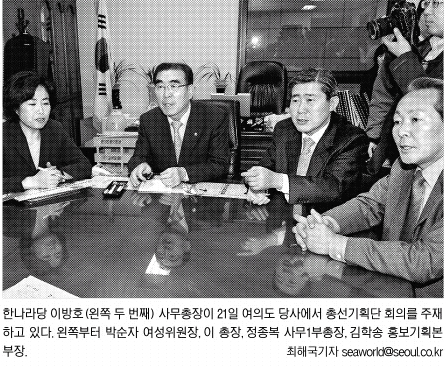 곧 구성될 공천심사위에 친이(親李) 핵심인 이방호 사무총장이 포함될 것이란 소식이 21일 알려지면서, 친박(親朴) 쪽에서는 ‘탈당’‘분당’과 같은 최후통첩성 발언까지 돌출했다. 총선기획단은 23일 외부인사 6명과 내부인사 5명 등 총 11명의 공천심사위 인선을 확정해 24일 최고위원회에 보고할 예정인데, 이 때가 갈등의 분수령이 될 전망이다.