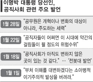 이는 이 당선인이 최근 공무원을 향해 잇따라 던진 ‘경고 메시지’의 의미를 설명하는 한편, 감싸안기에 나선 것으로 해석된다. 또 노무현 대통령이 지난 24일 “공무원 전체를 개혁의 대상으로, 또 공공의 적으로 삼아선 안 된다.”고 비판한 데 대한 대응 성격으로도 풀이된다.