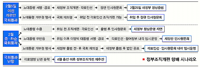 노 대통령이 개편안에 서명도, 거부도 하지 않는다면 이 당선인이 취임과 동시에 임시 국무회의를 열어 개편안을 서명하고 공포할 수 있다. 다만 새 정부가 들어선 뒤에도 당분간 참여정부 내각이 유지되는 기현상은 피할 수 없다. 특히 개편안을 공포하려면 국무회의를 열어야 하는데, 여기에 참석할 국무위원이 폐지될 부처의 장관을 포함해 전원 참여정부의 장관들이 되는 것이다.