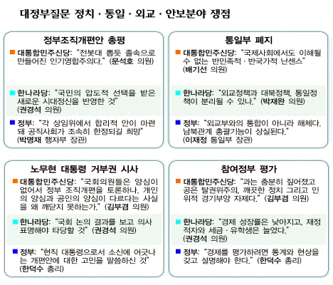 31일 국회 정치·통일·외교·안보 분야 대정부 질문의 초점은 단연 정부조직개편이었다. 대통합민주신당과 한나라당은 통일부 폐지 등 사안별로 충돌을 빚었지만 노무현 대통령의 거부권 시사가 부적절했다는 점에서는 공감대를 이뤘다. 정부측은 개편안 전체에 대한 평가는 유보했지만, 통일부 폐지에 대해서는 우려의 목소리를 냈다.