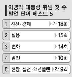 이명박 대통령은 취임 첫날 경제 발전을 통한 선진국 도약을 강조했다. 취임사에서 ‘선진’ ‘경제’ ‘발전’을 각각 10회 이상 언급했다.