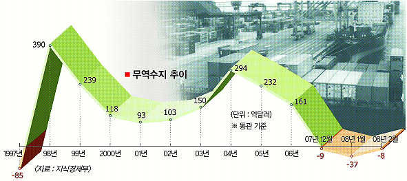 올 들어 누적 적자액은 45억달러. 이 같은 추세대로라면 올해 흑자 방어를 장담하기 어려운 실정이다. 무역수지는 1998년 흑자(390억달러)로 반전한 이래 지난해까지 10년 흑자행진을 이어왔다.2001년(93억달러) 한 해를 제외하고는 내리 세 자릿수 흑자였다. 정부는 당초 올해도 세 자릿수 흑자(130억달러)를 전망했다.