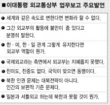 이 대통령은 업무보고에 앞서 외교부의 지난 10년간 행보를 ‘콕’ 짚어 질책했다. 이 대통령은 “외교부의 지나간 기간 한 것에 대해 만족하지 않는다.”고 잘라 말했다. 더 나아가 “만족하지 않는 정도가 아니라 불만이 좀 있다.”고 목소리를 높였다. 순간 참석자 대부분은 고개를 떨궜다. 특히 이 대통령은 “과거 외통부에 생각을 달리하는 사람들이 있어 무엇이 국익에 도움되는지 생각하지 않고 여러갈래로 의견을 달리했다.”고 꼬집었다. 미국·일본과의 관계가 소원해지고 북한 핵 문제 해결도 미흡한 원인의 중심에 외통부의 ‘코드외교’가 있었다는 것이다.