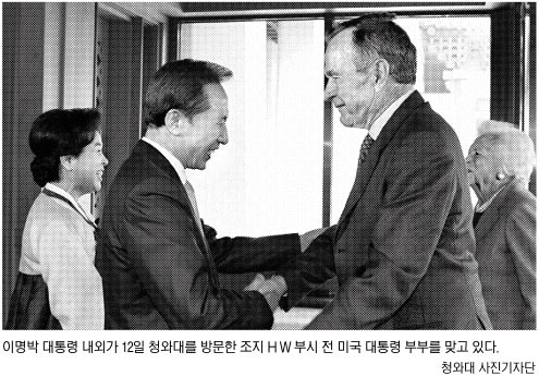 이 대통령이 ‘아버지 부시’를 만난 것은 이번이 처음으로 다음달 방미와 정상회담을 앞두고 있어 이날 만남은 더 관심을 끌었다.
