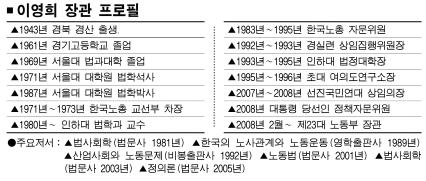 노동법 학자가 된 데는 이런 젊은 시절 노동운동 경험이 계기가 됐다. 이 장관이 취임하고 업무보고와 인사 등 시급한 일정을 마치자마자 달려간 첫번째 현장은 전태일 기념관이다. 이 장관과 노동계의 각별한 인연과 이 장관 이력의 시발점이 노동운동이라는 사실은 그래서 알려지기 시작했다.
