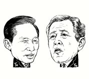 |워싱턴 진경호특파원|이명박(얼굴 왼쪽) 대통령과 조지 W 부시(오른쪽) 미국 대통령이 19일 오전(한국시간 19일 밤) 미 대통령 휴양지인 캠프 데이비드에서 정상회담을 갖고 두 나라 동맹관계를 강화·확대하는 방안과 함께 북핵 해결을 위한 공조 방안 등 양국간 현안을 논의한다.