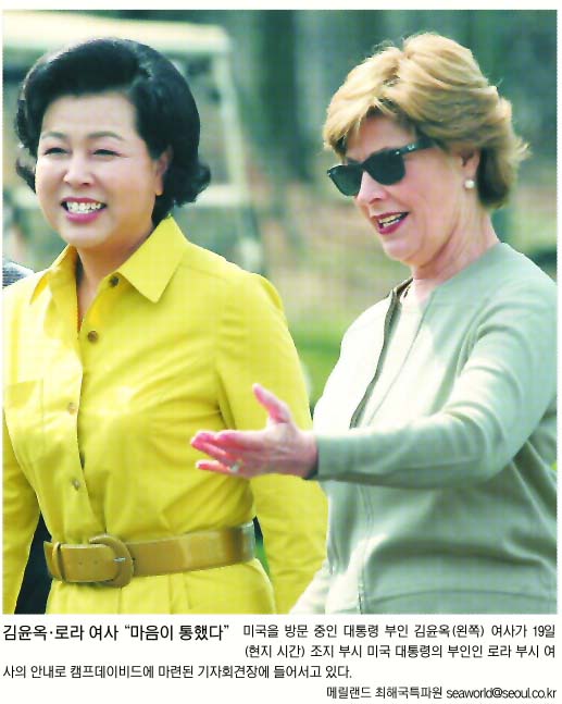 부시 대통령은 특히 아버지 부시 전 대통령 내외가 최근 청와대를 방문해 이 대통령 내외와 오찬을 함께 한 얘기를 꺼내며 “그때 청와대에서 부모님이 이 대통령 내외와 찍은 기념사진을 이곳에 전시해 뒀다.”고 소개하기도 했다. 김 여사와 로라 여사는 각각 백자 커피잔 세트와 텍사스산 꽃무늬 찻잔세트를 선물로 교환했다. 로라 여사는 선물을 받은 뒤 환하게 웃으며 “서로 마음이 통한 것 같다.”고 말했다.