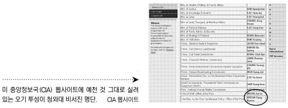 미 중앙정보국(CIA)이 이명박 정부의 청와대 참모진 명단을 엉터리로 소개했다.CIA로서도, 한국정부로서도 민망한 상황이다.CIA는 지난 27일 새소식란에 외국 정부 수반·각료들의 최신 명단을 소개했다. 여기엔 한국도 포함돼 있었다.