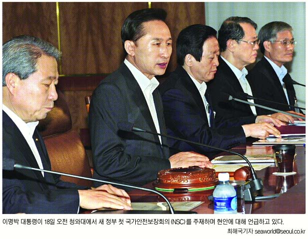 이명박 정부 들어 처음 열린 국가안전보장회의(NSC)에서는 최근 불거진 일본의 독도 영유권 명기 문제와 금강산 관광객 피격 사건에 대한 대응방안이 모색됐다.특히 두 사건이 정부의 상시적인 위기관리 시스템 부족 때문에 확산됐다는 분석이 나옴에 따라 범정부적인 컨트롤센터의 필요성에 대해서도 논의가 이뤄졌다.