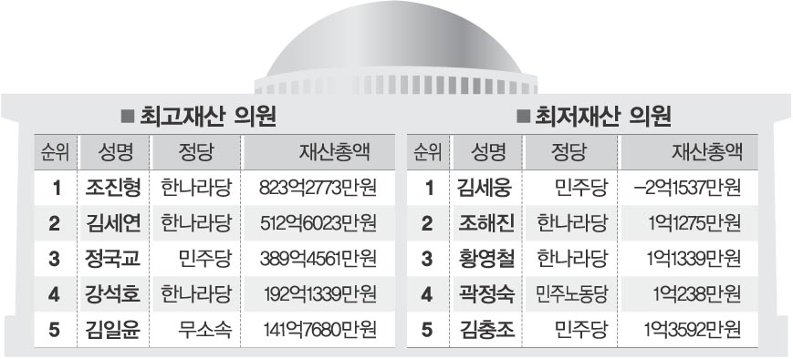 최고의 부동산 부자는 김세연 의원이다. 총 재산 512억 6000여만원 가운데 68.4%인 350억 3800여만원을 부동산 형태로 보유했다. 부산 동래구와 해운대구, 경남 양산 일대에 보유한 토지가 68건에 달한다. 매입하거나 아버지인 고 김진재 의원으로부터 상속받은 토지들이다. 김 의원은 서울 서초구에 38억원이 넘는 아파트를 보유하기도 했다.