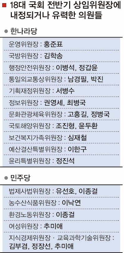 민주당은 아직 유동적이다. 원내 핵심관계자는 “3선 의원 가운데 상임위원장 경력이 없는 사람을 (위원장으로) 선정할 것”이라고 말했다.