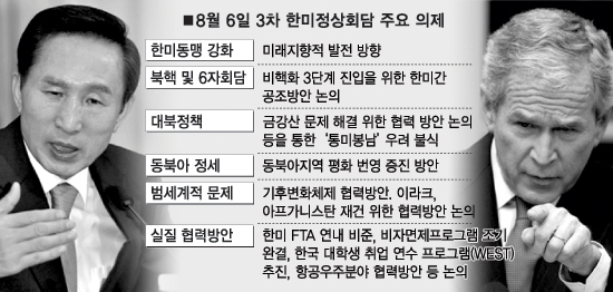 이명박 대통령과 부시 대통령은 6일 정상회담에서 한·미동맹, 대북문제, 북핵 6자회담 등 양국간 다양한 현안에 대해 의견을 교환할 예정이다.