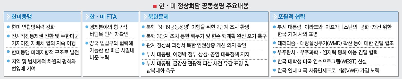 부시 대통령은 또 “한·미 동맹은 현대의 위대한 성공 스토리”라면서 “전 세계에서 열린 자유사회와 폐쇄된 은둔사회의 차이를 한반도만큼 극명하게 보여 주는 곳이 없다.”고 했다.