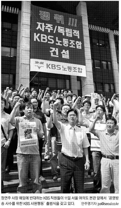 11일 이명박 대통령의 해임안 서명으로 정권 출범 이후 계속돼 온 정연주 KBS 사장 거취 논란이 새 국면으로 접어들었다.정 사장 해임 여부를 놓고 물밑 신경전을 펼쳐오던 보수·진보 진영의 대치가 법적 투쟁과 장외투쟁을 불사한 전면전 양상으로 치달을 조짐이다. 청와대는 야당의 거센 반발에 한 발 비켜서는 모습을 보였다. 정 사장을 해임한 마당에 정면 대응할 이유가 없다는 판단이다.