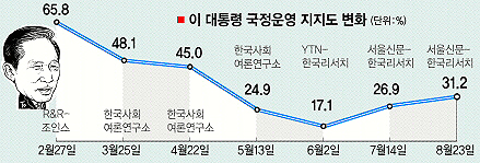 경희대 정치외교학과 윤성이 교수는 이와 관련,“촛불집회 등 적극적인 부정요소가 잠복하면서 기본지지도가 회복되는 과정”이라고 풀이했다.