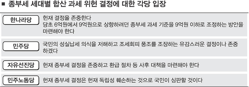 종부세가 참여정부의 상징적인 정책이라는 점에서 이번 헌재 결정이 전·현 정권의 갈등을 재연하는 도화선이 될 가능성도 높아 보인다. 국민의정부와 참여정부 기간을 ‘잃어버린 10년’으로 규정해온 여권으로서는 이번 결정을 전 정권의 정치적 흔적을 지우면서 10년간의 국정성과를 부정하는 계기로 삼을 수도 있다.