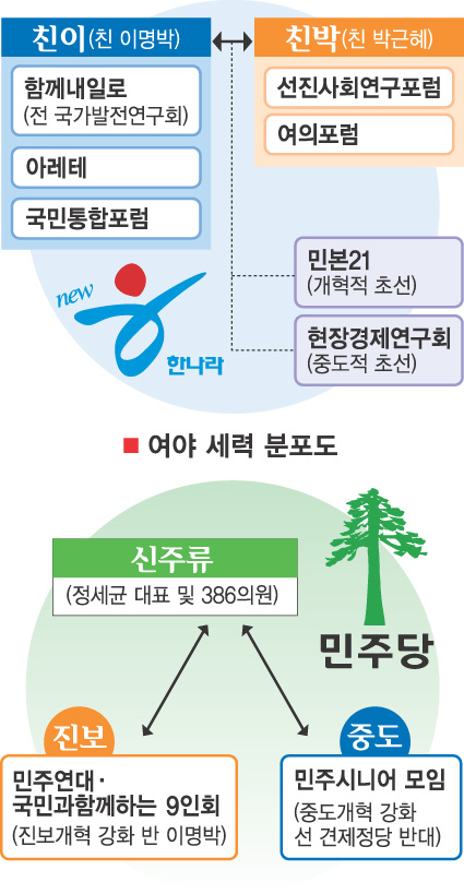 한나라당의 분화는 친이와 친박이라는 양대 계파의 신경전을 축으로 한다.각종 현안에서부터 멀리는 차기 대선까지 겨냥한 두 진영의 갈등은 당의 화학적 결합을 어렵게 만들고 있다.