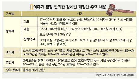 법인세 과세표준은 현행 1억원에서 2억원으로 높인다.법인세율도 내년부터 낮은 세율구간(2억원 이하)은 현행 13%에서 11%로 인하하고 2010년에는 10%로 더 낮추기로 했다.높은 세율구간(2억원 초과)은 내년에는 25%에서 22%로 인하되고 2010년에는 20%로 낮아진다.당초 정부가 요구한 상속·증여세 인하 요구는 이번엔 반영하지 않기로 의견을 모았다.
