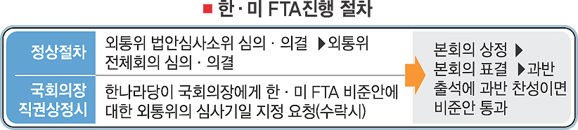 국회 외교통상통일위원회는 이날 오후 박진 위원장을 비롯해 한나라당 소속 의원 10명만 참석한 가운데 전체회의를 열어 한·미 FTA 비준 동의안을 상정했다.이에 따라 민주당이 비준 동의안의 의결을 위한 전체회의를 계속 저지할 경우 김형오 국회의장이 심사기일을 정해 본회의에 직권 상정할지 주목된다.박 위원장은 이날 오후 2시 전체회의 개회를 선언,2~3초 만에 비준 동의안을 상정하고,이를 법안심사소위에 넘겼다.