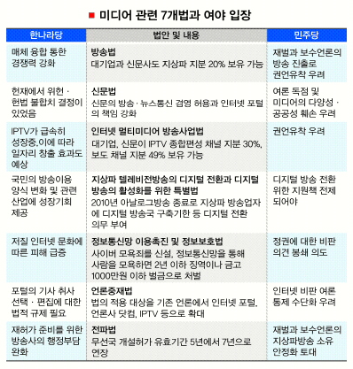 한나라당이 내놓은 미디어 관련법은 신문법과 방송법,정보통신망 이용 촉진 및 정보보호법,인터넷 멀티미디어방송사업법,언론중재법,지상파 TV방송의 디지털전환과 디지털방송의 활성화를 위한 특별법,전파법 등이다.이 가운데 최대 쟁점은 방송법이다.한나라당이 밀어붙이고 있는 방송법 개정안은 대기업과 신문사의 방송 사업 참여를 허용하는 내용을 담고 있다.방송의 1인 소유제한도 현행 30%에서 49%로 대폭 완화했다.기존 사업자와 경쟁관계를 형성해 관련 산업을 발전시키고 일자리 창출도 할 수 있다는 논리다.