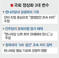 여야가 5일 어렵사리 테이블에 앉았지만 협상은 결렬됐다.국회가 전날 김형오 국회의장의 ‘최후 통첩’과 민주당의 로텐더홀 점거 해제로 정상화 길목에 들어섰지만 이날 3개 교섭단체 원내대표 회담에서 교집합을 이끌어내지 못한 채 6일 다시 만나기로 했다. 3개 교섭단체 원내대표들은 이날 오후 2시와 6시에 공식회담을 갖는 등 대화의 물꼬를 열었지만 속시원한 결과를 이끌어내진 못했다. 밤 늦게까지 열린 회담에서 여야 원내대표들은 법안 처리방식과 기준, 내용 등을 놓고 진통을 거듭하다 끝내 합의에 실패했다. 미디어관련법과 한·미 자유무역협정(FTA) 비준동의안 등 쟁점법안에 대해선 평행선을 달린 것으로 알려졌다. 한나라당은 2월 임시국회에서 처리하는 쪽으로, 민주당은 논의는 하되 처리에 강제성을 두지 말자는 입장을 굽히지 않았다는 후문이다. 완전 정상화로 가는 길은 여전히 가시밭투성이다. 국회 정상화를 가로막는 3대 변수도 만만치 않다.