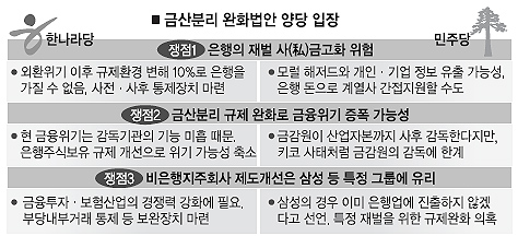 여야간 ‘입법전쟁’의 화두가 단연 금산분리 완화 문제로 모이는 것도 이같은 예측과 무관치 않다. 금산분리완화 정책은 대기업 등 산업자본의 은행지분 소유한도를 4%에서 10%로 확대하고, 보험·증권 등 비은행 금융지주회사가 제조회사 등 비금융회사를 자회사로 지배할 수 있도록 하는 게 핵심이다.