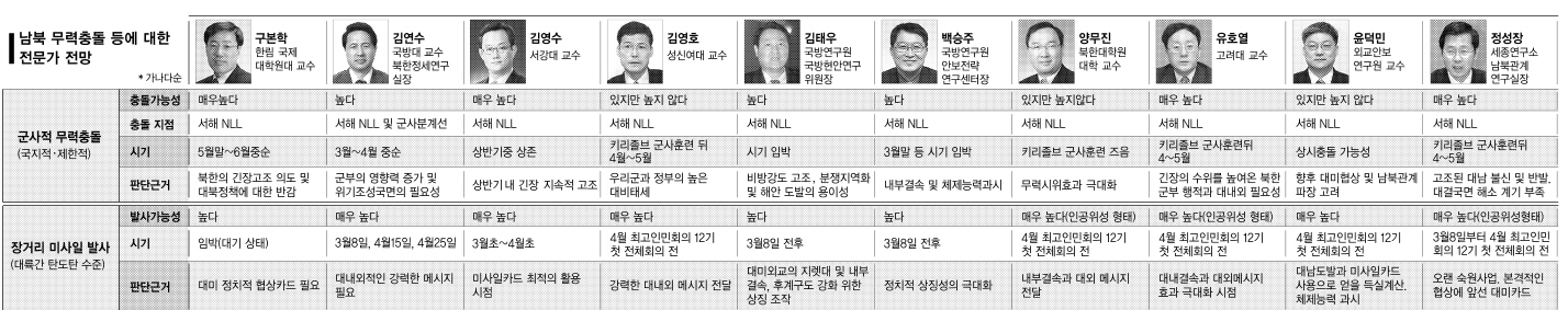 김영수 서강대 교수는 “남북긴장이 올 상반기 내내 높아질 가능성이 적지 않다.”면서 “장거리 미사일 발사 뒤 5~6월쯤 단거리 미사일 발사로 교섭능력을 강화하려 할 가능성이 높다.”고 진단했다.