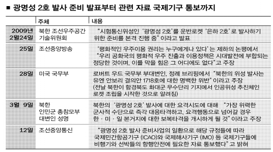 그러나 한·미 정보당국에 포착된 북한의 미사일 발사 움직임은 이보다 빠른 올 1월 중순쯤이었다. 이어 미 정보당국이 2월 초 위성관측을 통해 함경북도 무수단리 기지에서 원격측정 장비의 조립 장면을 포착했다. 무수단리 기지는 2006년 7월 대포동 2호가 발사된 장소이다.