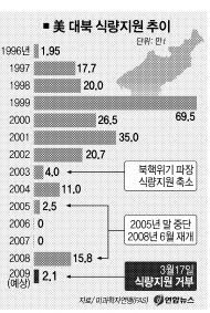 실제로 미국은 겉으로는 정치·안보적 상황과 인도주의적 지원을 연계하지 않는다면서도 과거 북한 핵위기 때 대북 원조를 크게 줄였던 전례가 있다. 미국은 지난 2001년 35만t, 2002년 20만 7000t의 식량을 지원했으나 2002년 2차 핵위기 이듬해인 2003년 대북식량 지원을 4만 200t으로 줄였다.