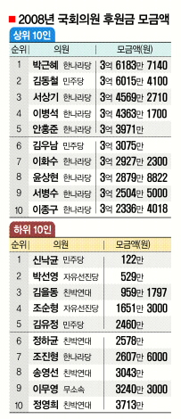기부 한도액인 1인당 연간 500만원을 가장 많이 확보한 의원은 한나라당 박근혜·김무성 의원으로 30건씩이었다. 뒤이어 윤상현 의원 28건, 이상득 의원 25건, 박진·김영선·나경원 의원 각각 24건이었다. 모두 한나라당 의원이다. 개인별 모금액 한도 3억원을 채운 의원은 55명이었다. 상위 20명에는 한나라당 의원이 14명 포함됐고, 민주당 5명, 민주노동당 1명이었다.