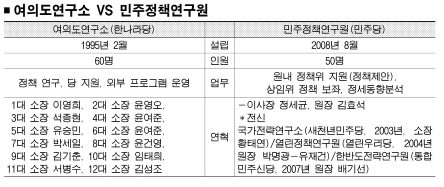 여의도연구소와 민주정책연구원은 각각 한나라당과 민주당의 ‘머리 싸움’을 지원하는 싱크탱크다. 4월 임시국회에서 처리될 추가경정예산안과 여야가 첨예하게 맞선 입법전쟁, 4·29 재·보선 등 각종 정치·정책 현안에 대해 기본 전략과 전술을 수립하고 여론조사를 실시한다.