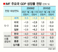 국제통화기금(IMF)이 내년 우리나라 국내총생산(GDP) 성장률 전망치를 지난 1월 예측했던 4.2%보다 2.7% 포인트 낮은 1.5%로 수정했다. 우리나라의 중심 수출시장인 미국과 유로, 일본 등 선진국 경제의 회복 속도가 당초 예상보다 완만할 것으로 예측됐기 때문이다. 주요 20개국(G20)은 물론 홍콩 싱가포르 등 아시아 신흥공업국(NIEs) 중 전망치 하락 폭이 가장 크다. 올해는 당초 전망치인 -4%를 유지했다.
