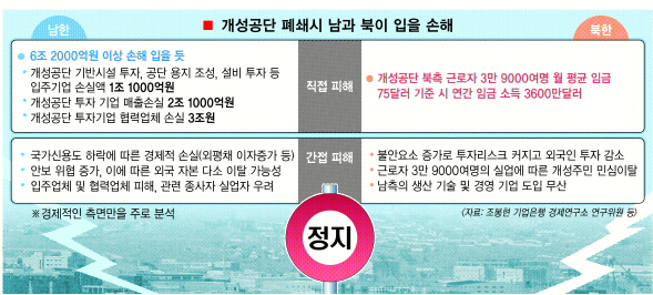 북한 경제 전문가인 기업은행 경제연구소 조봉현 연구위원은 23일 “22일까지의 개성공단 상황을 살펴본 결과 개성공단 폐쇄 때 남측은 6조 2000억원의 직접 손실과 9조 4000억원의 간접적 손실을 입을 것으로 보인다.”고 분석했다.