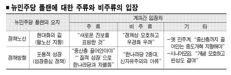 민주당내 주류와 비주류가 19일 또다시 맞붙었다. 새로운 정체성과 노선 설정을 위해 마련된 ‘뉴 민주당 플랜’이 불씨가 됐다. 이날 오후 ‘뉴 민주당 플랜’을 논의하기 위해 서울 영등포 당사에서 마련된 국회의원·지역위원장 전체회의에서다. 앞서 뉴 민주당 비전위원회(위원장 김효석)는 지난 17일 보수와 진보의 이분법을 뛰어넘는 ‘현대화의 길’을 새 노선으로 삼고, 사람 중심의 ‘포용적 성장’과 기회의 평등을 확대하는 ‘기회의 복지’를 2대 발전전략으로 설정한 ‘뉴 민주당 플랜’ 초안을 발표했다.