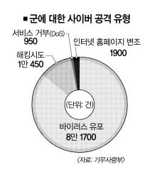 한편 국군기무사령부가 이날 연 제7회 국방정보보호 콘퍼런스에서 군에 대한 사이버 공격이 하루 평균 9만 5000여건에 이르는 것으로 드러났다. 유형별로는 해킹 시도 1만 450건, 바이러스 유포 8만 1700건, 비정상적 트래핑을 유발하는 ‘서비스 거부’(DoS) 공격 950건, 인터넷 홈페이지 변조 1900여건 등이다.