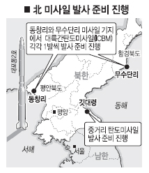│도쿄 박홍기특파원│북한이 평안북도 철산군 동창리 기지와 함경북도 화대군 무수단리 기지에서 대륙간 탄도미사일(ICBM)의 발사 준비를 진행하고 있는 것으로 파악됐다고 일본 산케이신문이 17일 보도했다.