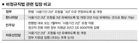비정규직 보호법의 처리 문제를 둘러싼 여야 협상이 급물살을 탈지 주목된다. 자유선진당이 현행법의 핵심 쟁점인 ‘비정규직 사용기간 2년’ 조항의 시행 시점을 ‘내년 7월’로 1년 유예하고, 정부가 비정규직의 정규직 전환을 위한 지원금을 집행하는 중재안을 내놓은 데 따른 것이다. 한나라당과 민주당의 의견을 조금씩 절충한 방안이다.