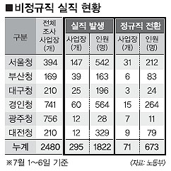 이어 “지난 6일간 비정규직법 때문에 실직한 사람은 1822명이고 정규직 전환자는 673명으로 전체의 73%가 해고된 것으로 조사됐다.”면서 “정부가 예상한 대로 70%가 실직을 하고 있고 결국 앞으로 1년간 50만~70만명이 해고될 것”이라고 말했다. 하루 2000~3000명 정도가 해고될 수 있다는 얘기다. 이 장관은 2840개 사업장을 조사해 하루 300여명꼴로 해고가 발생하는 것으로 파악했는데 비정규직법 적용 기업이 50만개인 점을 감안하면 정부의 예측은 충분히 일리가 있다고 강조했다.