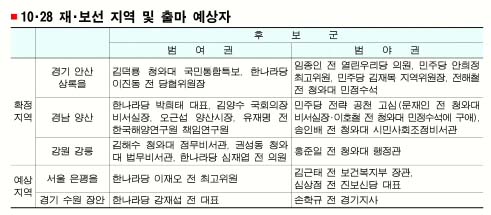 29일 현재까지 재·보선이 확정된 곳은 경기 안산 상록을, 경남 양산, 강원 강릉 등 세 곳이다. 서울 은평을, 경기 수원 장안도 예상지역으로 분류된다. 여야는 이번 재·보선을 통해 정치 거물들을 복귀시킬 계획을 갖고 있다. 여당내 계파 갈등의 중심에 선 친박(親朴) 무소속 바람이 재연될지, 친노(親) 진영의 정치 복귀가 현실화될지도 주요 관전 포인트가 될 것으로 보인다.
