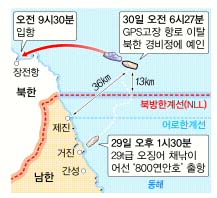 국방부와 통일부에 따르면 선원 4명이 탑승한 29t급 오징어 채낚이 어선 ‘800 연안호’(선장 박광선·54)가 이날 오전 5시5분쯤 강원도 제진(옛 저진) 동북쪽 36㎞ 상의 동해 NLL을 13㎞가량 넘어갔다 북한 경비정 1척에 의해 예인됐다.