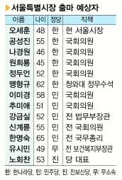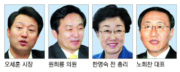 민선 서울시장 최초로 재선을 노리는 오세훈 현 시장에게는 적잖은 부담이다. 오 시장은 대과(大過) 없이 시정을 이끌어왔다는 평이다. 하지만 친정인 한나라당 내 부정적인 여론이 장애요소로 지적된다. 지난 총선 때 한나라당 의원들이 ‘뉴타운’ 공약에 발목 잡혔을 때, 오 시장이 애매한 태도를 보인 것이 화근이다. 의원들이 청와대의 의중에 촉각을 곤두세우면서도, 경선의 필요성을 거론하는 이유다. 당 안팎에선 공성진 최고위원, 홍준표 전 원내대표, 원희룡·정두언·박진·나경원 의원, 맹형규 청와대 정무수석비서관, 유인촌 문화체육관광부 장관 등이 후보로 거론된다. 서울시당위원장을 지낸 공 최고위원은 당협협의회와 교류하며 기반을 다졌다. 원 의원은 정책·공약 개발에 공을 들이고 있다.