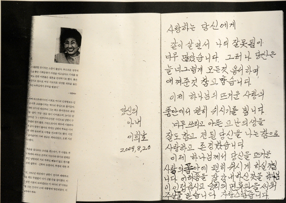 ‘사랑하는 당신에게’로 시작되는 편지에서 이 여사는 “같이 살면서 나의 잘못됨이 너무 많았습니다. 그러나 당신은 늘 너그럽게 모든 걸 용서하며 아껴준 것, 참 고맙습니다.”면서 “이제 하나님의 뜨거운 사랑의 품 안에서 편히 쉬시기를 빕니다.”라고 적었다.